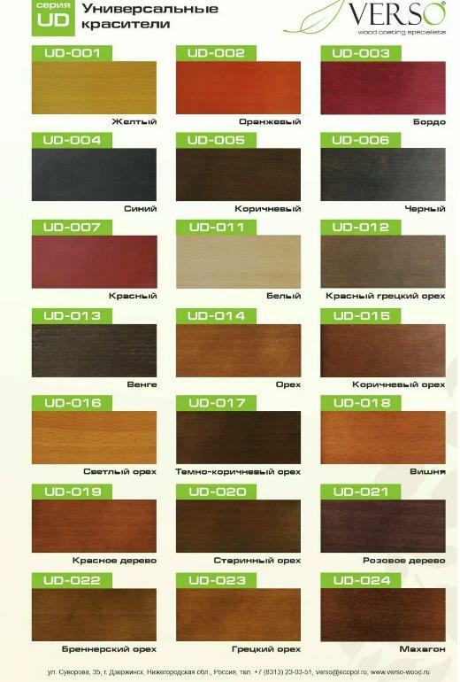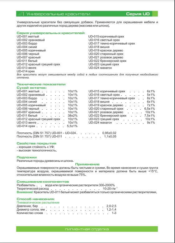 Универсальные красители без связующих добавок. Применяются для окрашивания мебели и других изделий из различных пород дерева (массива или шпона). Все красители могут смешиваться между собой в любых соотношениях для получения необходимого оттенка.